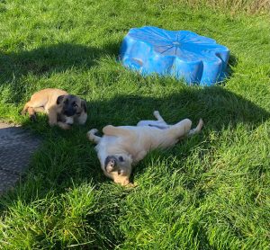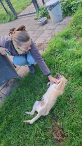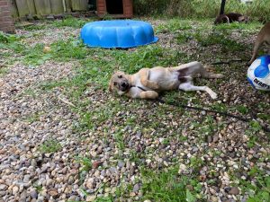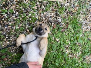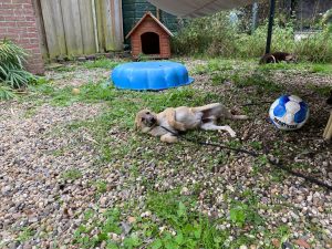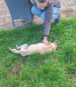 Hij kan echt heerlijk genieten van alle aandacht , hij zich heerlijk kroelen en dan trilt zijn buikje van plezier. Dat maakt hem juist zo bijzonder: zijn zachtaardige karakter en zijn verlangen om erbij te horen. Samen met de andere honden op het veld vindt hij geweldig, lekker samen spelen.