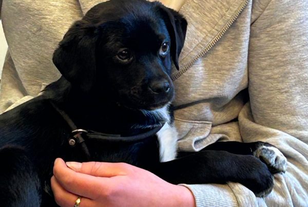 Bommel sliep daar netjes in een bench en kan daar ook rustig verblijven wanneer hij even alleen is. Tijdens het wandelen doet hij netjes zijn behoeftes buiten. Hij is een slimme en leergierige hond die graag samen met zijn baasje de wereld verder wil ontdekken.