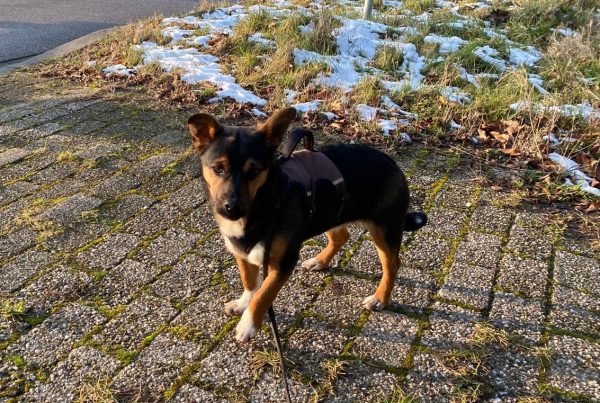 Ze huppelt vrolijk aan de lijn mee, ondertussen haar omgeving in zich opnemend zonder daarbij te reageren op verkeer, mede soortgenootjes etc.